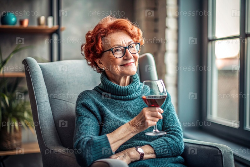 Современная, стильная пожилая женщина с бургундскими волосами со стаканом красного вина на стуле в гостиной дома