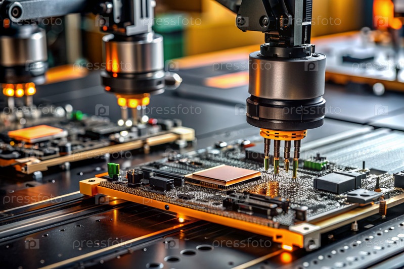 Автоматизированное производство электронных устройств. Современные роботизированные манипуляторы на сборочной линии чипов и печатных платок на современном электротехническом заводе. Установка компонентов на доске