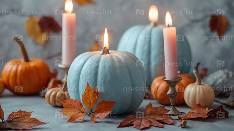 Пастельный розовый и синий тыквенные цвета, светло-синие и розовые свечи и осенние листья на светлом фоне
