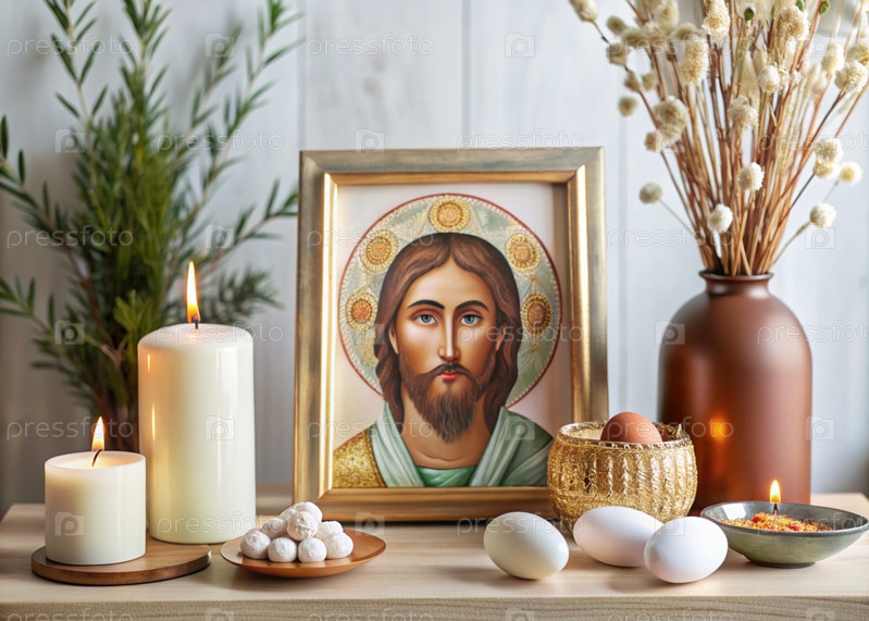 Православный Пасхальный торт, окрашенные яйца, иконы, лица святых, цветы, церковные свечи и пасхальное украшение на деревянном столе в старом деревенском доме