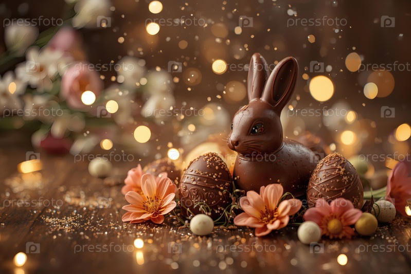 Шоколадное пасхальное яйцо, шоколадный кролик и весенние цветы на деревянном фоне. Пасхальные сладости и лакомства. Концепция яркого праздника Пасхи в 2026 году. Хорошая открытка