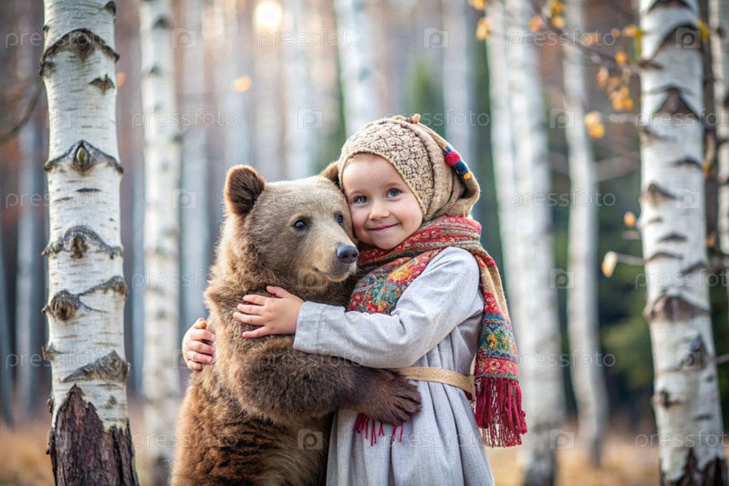 Красивая маленькая девочка в русской народной одежде и с платками на голове в березовой роще с живым медведем Русский фольклор, славянская мифология