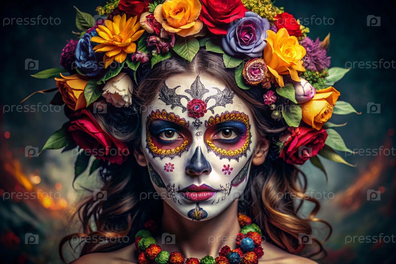 Концепция Хэллоуина. Ужасно. Костюмированная вечеринка. Красивая женщина с покрашенным черепом на лице и цветами на голове. Баннер, открытка