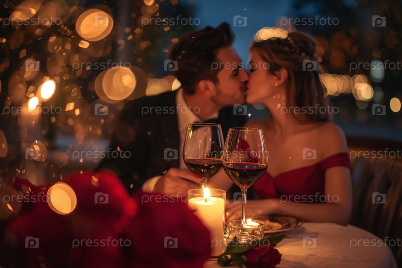 Концепция Дня святого Валентина: элегантная пара, целующаяся на романтическом ужине при свечах с бокалами вина в роскошный вечер