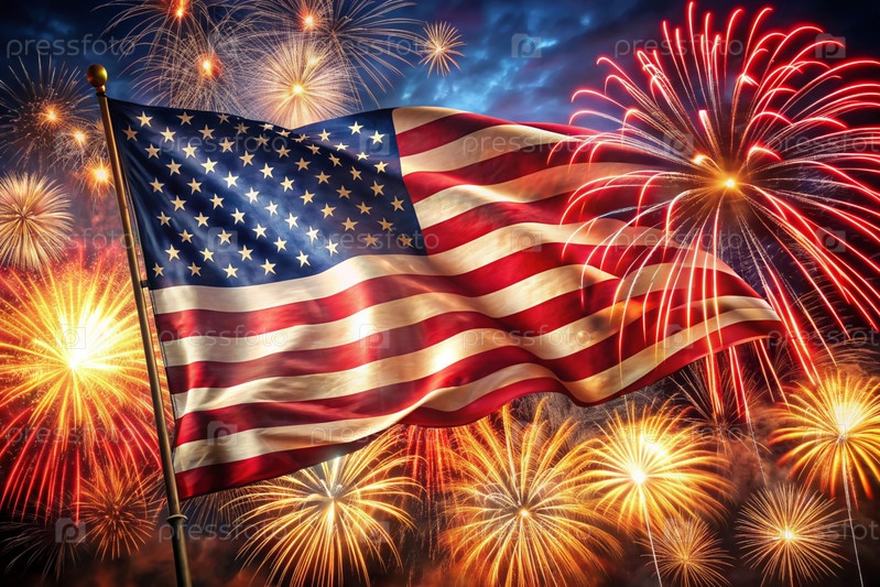 Флаг США с фейерверком в небе День независимости - 4 июля под открытым небом