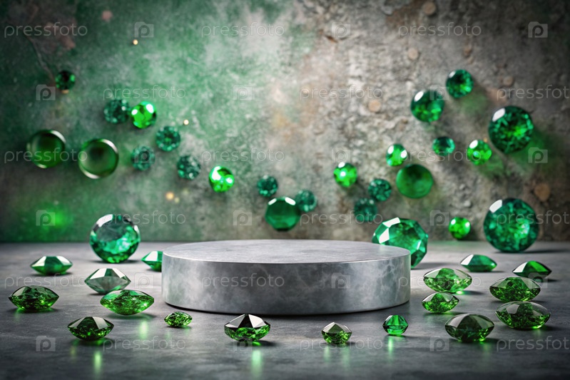 Минималистский фон для демонстрации ювелирных изделий. Современная пустая трибуна с серой стеной и изумрудами. Креативный дизайн презентации продукта
