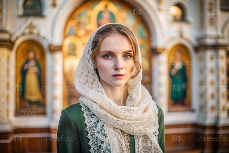 Портрет красивой молодой женщины с платками в православной церкви.Девушка молится в церкви среди икон