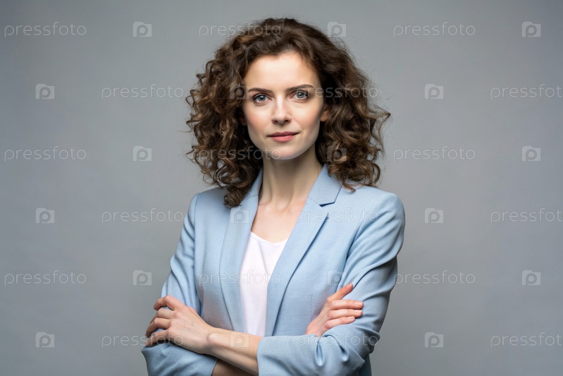 Брюнетка-бизнесменка с кудрявыми волосами, она одета в обычный синий блейзер и пиджак.Руки пересечены на груди, смотрит прямо в камеру