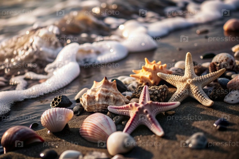 Концепция морского отдыха. Морские ракушки и морские звезды в песке у моря. История летних каникул. Копия текстового расположения
