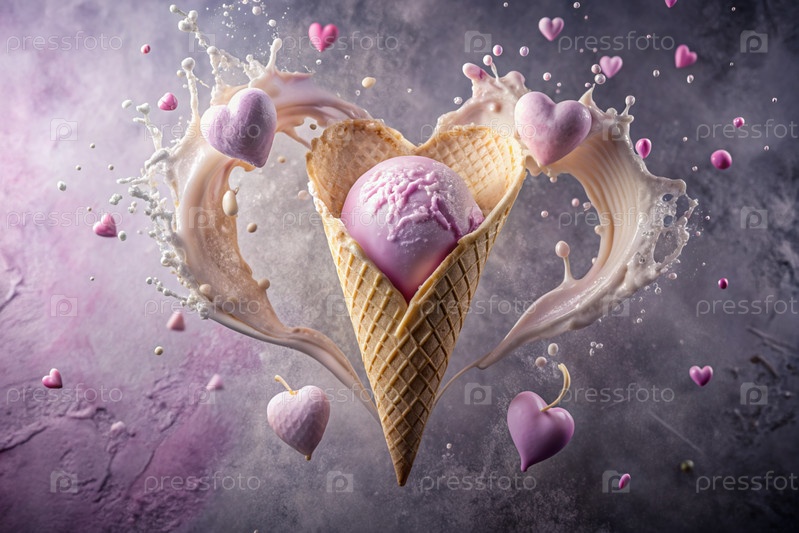 Сладкий десерт. Любовь к мороженому. Сердечно-образный конус мороженого с брызгами, сердцами и пятнами. Концепция Дня святого Валентина. Баннер, реклама