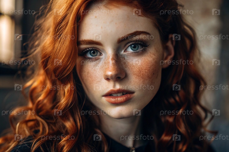 Глубокий эмоциональный портрет.Лицо молодой девушки без макияжа, с выразительными глазами, кудрявыми красными волосами и веснушками на лице. Естественная женская красота
