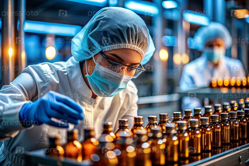 Производство лекарств: фармацевт тестирует медицинские флаконы на автоматическом трубопроводе фармацевтической производственной линии с использованием искусственного интеллекта