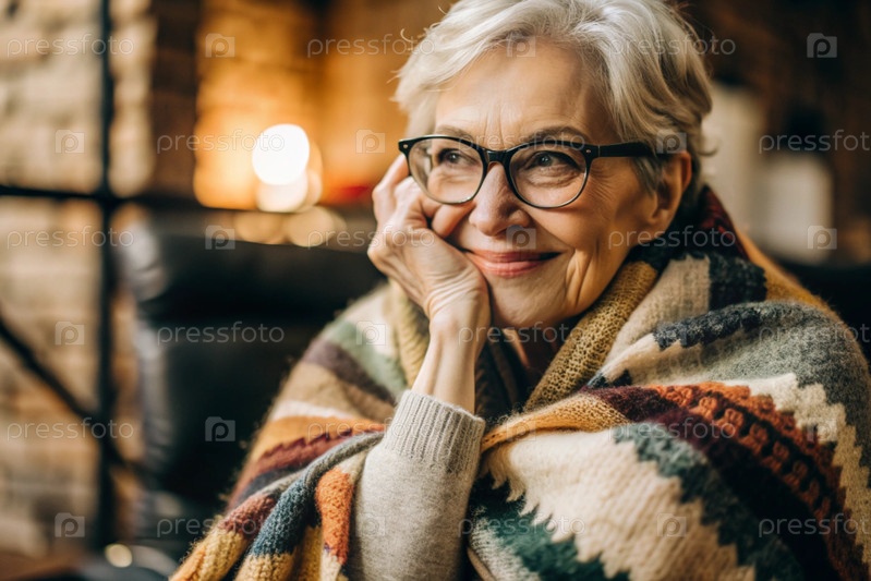Осенний портрет красивой пожилой женщины, пенсионерки 70 лет. Он завернут в теплую клетку с этническим рисунком. Концепция жизни пожилых людей
