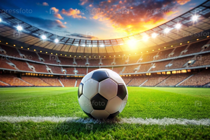 Футбольный мяч на зеленом поле футбольного стадиона, готовый играть в центре поля