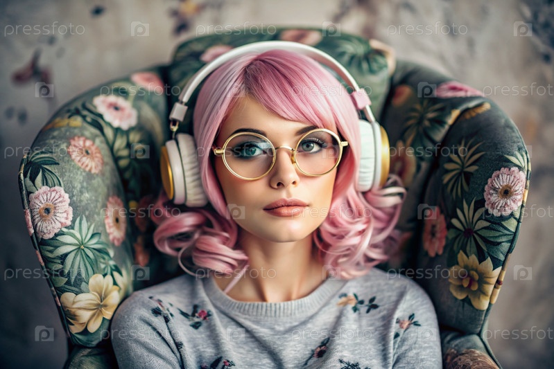 Молодая красивая девушка с розовыми волосами слушает музыку в больших беспроводных наушниках дома, на стуле в гостиной