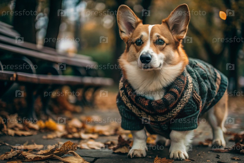 Любимый питомец: милая валлийская собака Корги в вязанном теплом комбинезоне на прогулке по городу