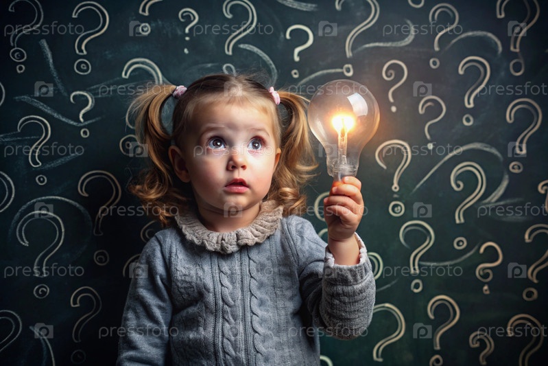 Развитие и образование детей. Вдумчивые девочки на темном фоне с лампочкой и вопросительными знаками. Брайнсторминг и концепция идеи