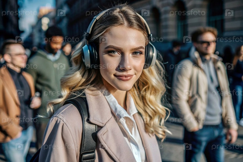 Музыкальный любитель. молодая красивая кудрявая женщина с рюкзаком на фоне улицы и людей. Турист слушает музыку в наушниках и гуляет по городу