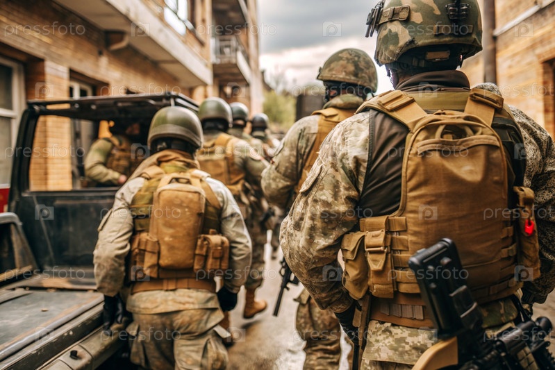 Военные действия.Солдаты элитного антитеррористического подразделения армии находятся среди разрушенных зданий.Очистите территорию врага