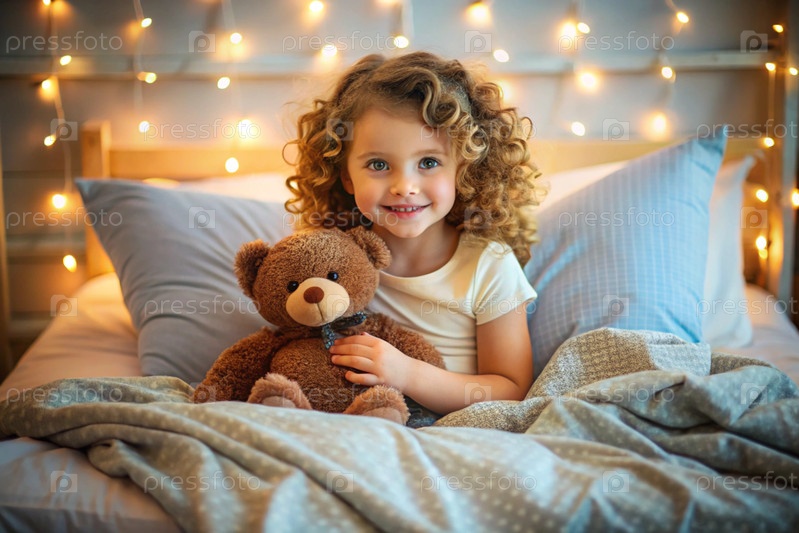 Красивая кудрявая девушка обнимает плюшевого медведя, сидя в уютной кровати, маленький ребенок обнимает игрушку и готовится к постели