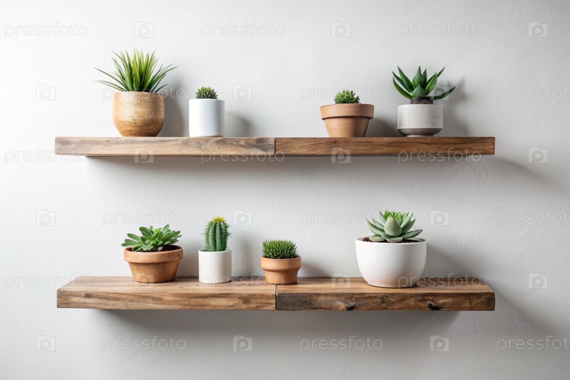 Детали дизайна интерьера. На яркой стене расположены деревянные полки с горшковыми растениями. Скандинавский стиль