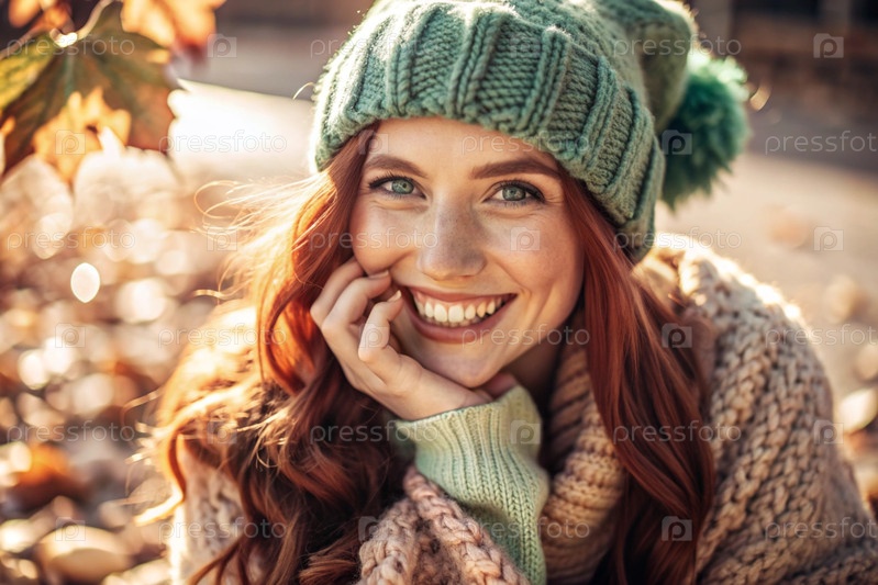Осенний портрет. Близкий план молодой рыжеволосой женщины с ярко выраженными зелеными глазами в вязанной шляпе и свитере. Девушка смеется под лучами закатывающегося осеннего солнца