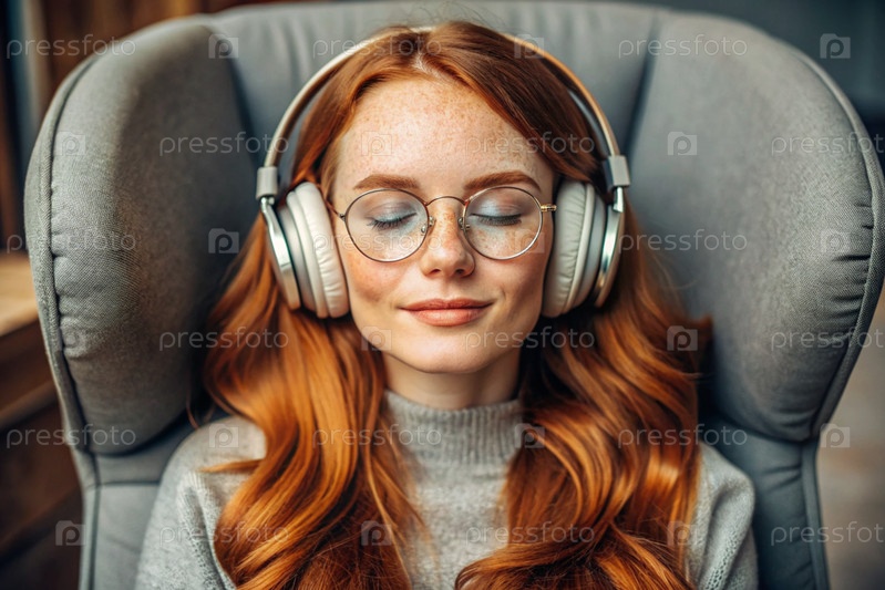 Молодая красивая рыжеволосая женщина с веснушками слушает музыку в больших беспроводных наушниках дома на стуле в гостиной