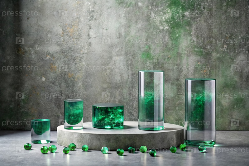 Минималистский фон для демонстрации ювелирных изделий. Современная пустая трибуна с серой стеной и изумрудами. Креативный дизайн презентации продукта