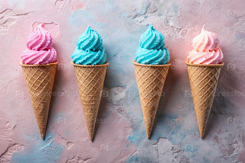 сладкий десерт. морозильные шишки разных вкусов. синий, розовый и фиолетовый мороженое на фоне трех пастельных цветов: синего, розового и фиолетового