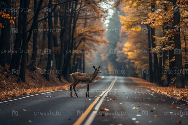 Красивый осенний пейзаж. Животное - это олень на дороге возле леса рано утром. Дорожные опасности, дикая природа