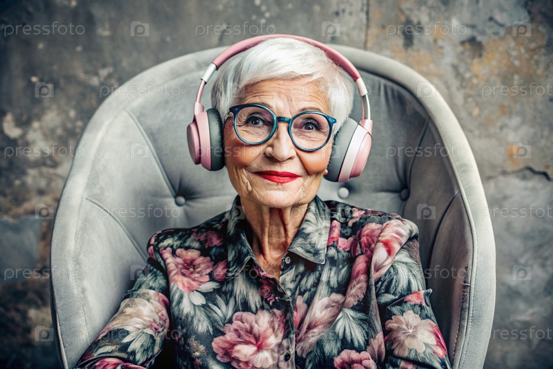 Стильная, современная, счастливая 60-70-летняя женщина слушает музыку в больших беспроводных наушниках дома, на стуле в гостиной