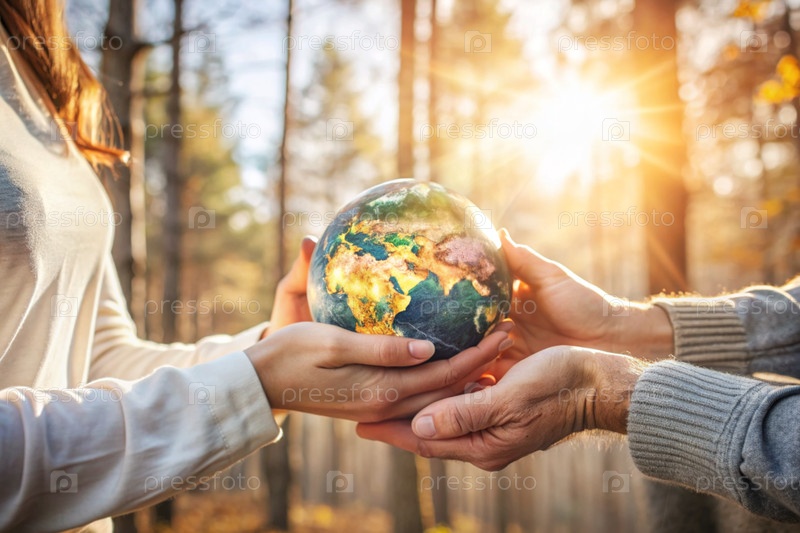 Мужчины и женщины держат маленькую модель Земли. Возрождение. Забота о планете, экологическое сознание и единство людей в сохранении природы