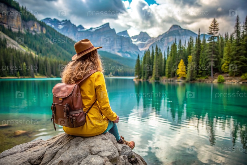 Женщина с кудрявыми светлыми волосами сидит на скале со рюкзаком на спине среди живописного озера и гор
