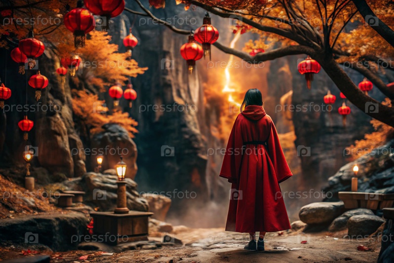 Японская девушка в традиционном национальном костюме - кимоно. На сказочном фоне фонарики и осенние деревья. Портрет символизирует традиции и культуру народа Японии