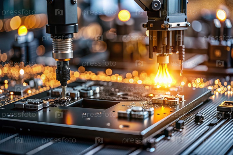 Автоматизированное производство электронных устройств. Современные роботизированные манипуляторы на сборочной линии чипов и печатных платок на современном электротехническом заводе. Установка компонентов на доске