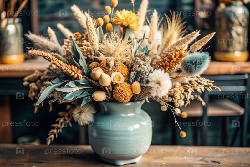 Красивый букет сушеных цветов в керамической вазе на древнем деревянном шкафу. Букет цветов в вазе во внутренней части дома. Светлый, бежевый, синий цветочный фон