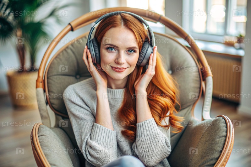 Молодая красивая рыжеволосая женщина с веснушками слушает музыку в больших беспроводных наушниках дома на стуле в гостиной