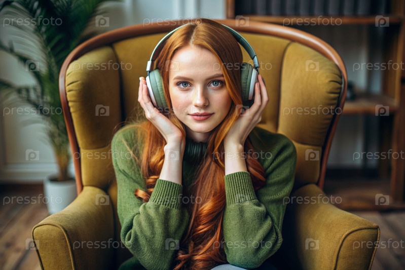 Молодая красивая рыжеволосая женщина с веснушками слушает музыку в больших беспроводных наушниках дома на стуле в гостиной
