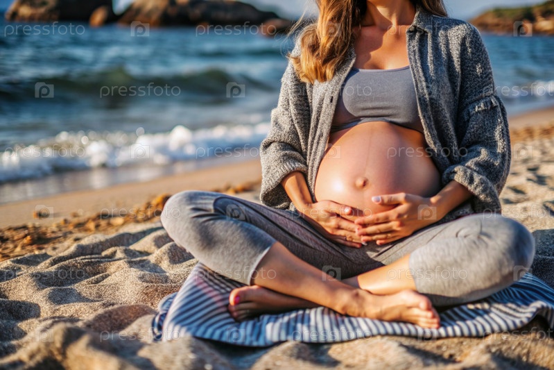 Расслабление, спокойствие, морской воздух. Закрытие живота. Беременная женщина на пляже у моря. Концепция беременности, родов и родительских обязанностей