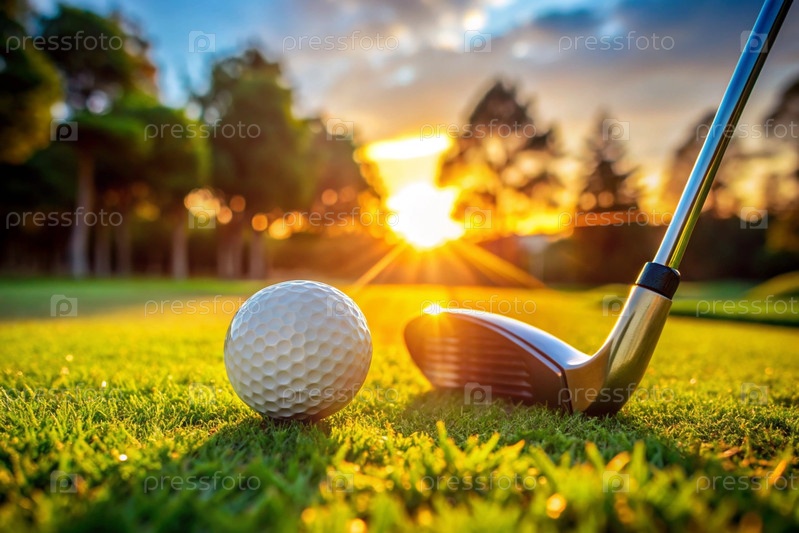 Баннер. белый мяч и металлическая клюшка для гольфа лежат на газоне в руках мужчины среди заката солнца. реклама матча по гольфу в кантри-клубе. свободное место для текста