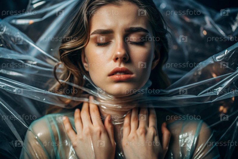 Девочка завернута в целлофан или сумку. Девушка задыхается. Пластиковое загрязнение планеты. Опасность для окружающей среды. Сокращение повторного использования пластика. Переработка. Концепция мусора