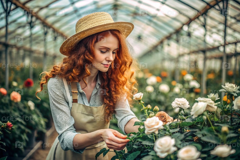 Портрет красивого садовника с рыжими волосами в соломенной шляпе, работающего с розами в стеклянной теплице