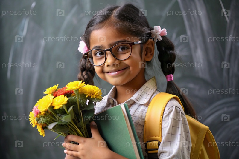 Милая, красивая первоклассница с очками. Букет цветов. Ребенок впервые идет в школу. Ребёнок с рюкзаком, книгой и цветами. Возвращение к школе