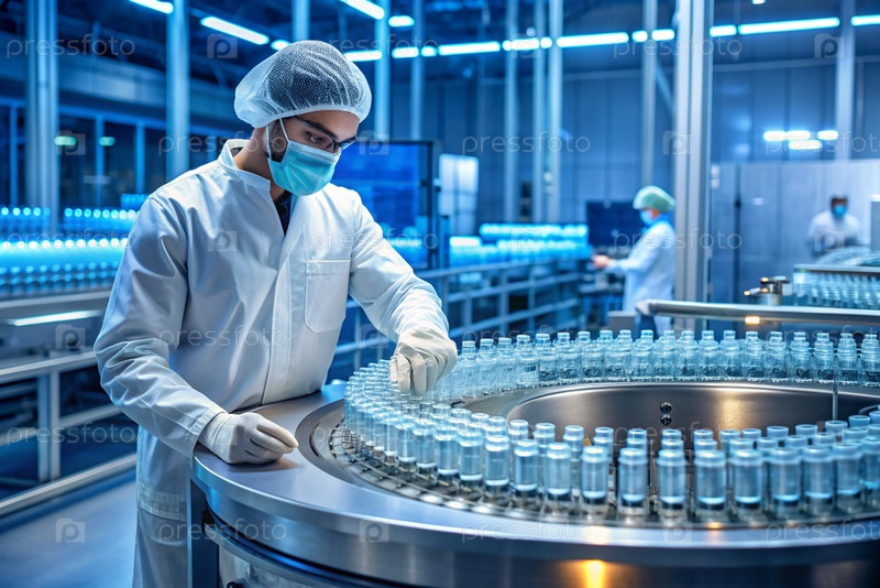 Производство лекарств: фармацевт тестирует медицинские флаконы на автоматическом трубопроводе фармацевтической производственной линии с использованием искусственного интеллекта