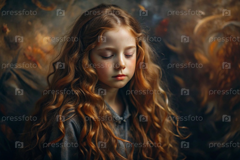 Портрет красивой маленькой рыжеволосой девочки с длинными волнистыми волосами и задумчивым взглядом.Власы развиваются и создают ощущение легкости и естественности