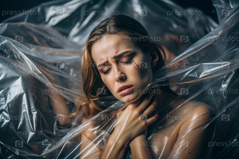 Девочка завернута в целлофан или сумку. Девушка задыхается. Пластиковое загрязнение планеты. Опасность для окружающей среды. Сокращение повторного использования пластика. Переработка. Концепция мусора