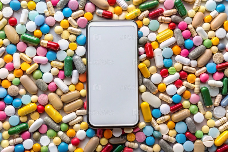 Здоровье и медицина. Аптека, онлайн-заказ, покупка и доставка. Смартфон с пустым экраном на куче красочных таблеток, таблетки, капсулы, диетические добавки и витамины