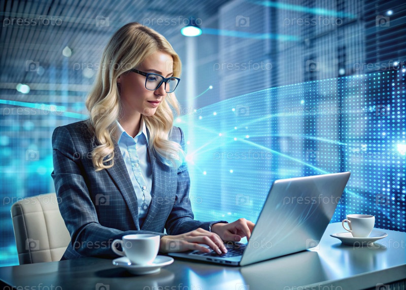 Красивая молодая женщина в костюме работает на ноутбуке в офисе с цифровыми кодами на виртуальном экране Цифровые технологии будущего Разработка программного обеспечения