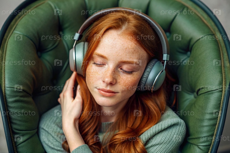 Молодая красивая рыжеволосая женщина с веснушками слушает музыку в больших беспроводных наушниках дома на стуле в гостиной
