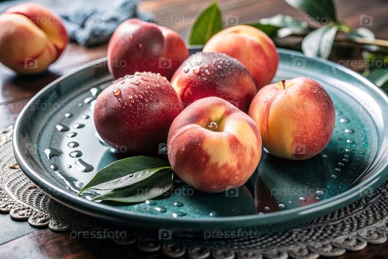 Свежие персики.Вкусные ягоды и фрукты ярко-желтого и красного цвета с капельками воды.Вегетарианство.Здоровое питание.Свежий плод на столе